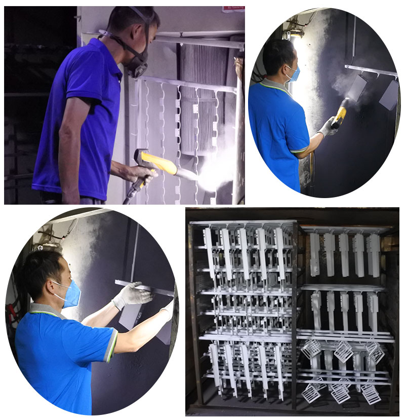 2、用靜電粉末噴涂機對產品進行粉末噴涂,在高壓靜電環境下,粉末帶負極性,粉末通過靜電噴涂槍,形成帶電粒子吸附在產品上。